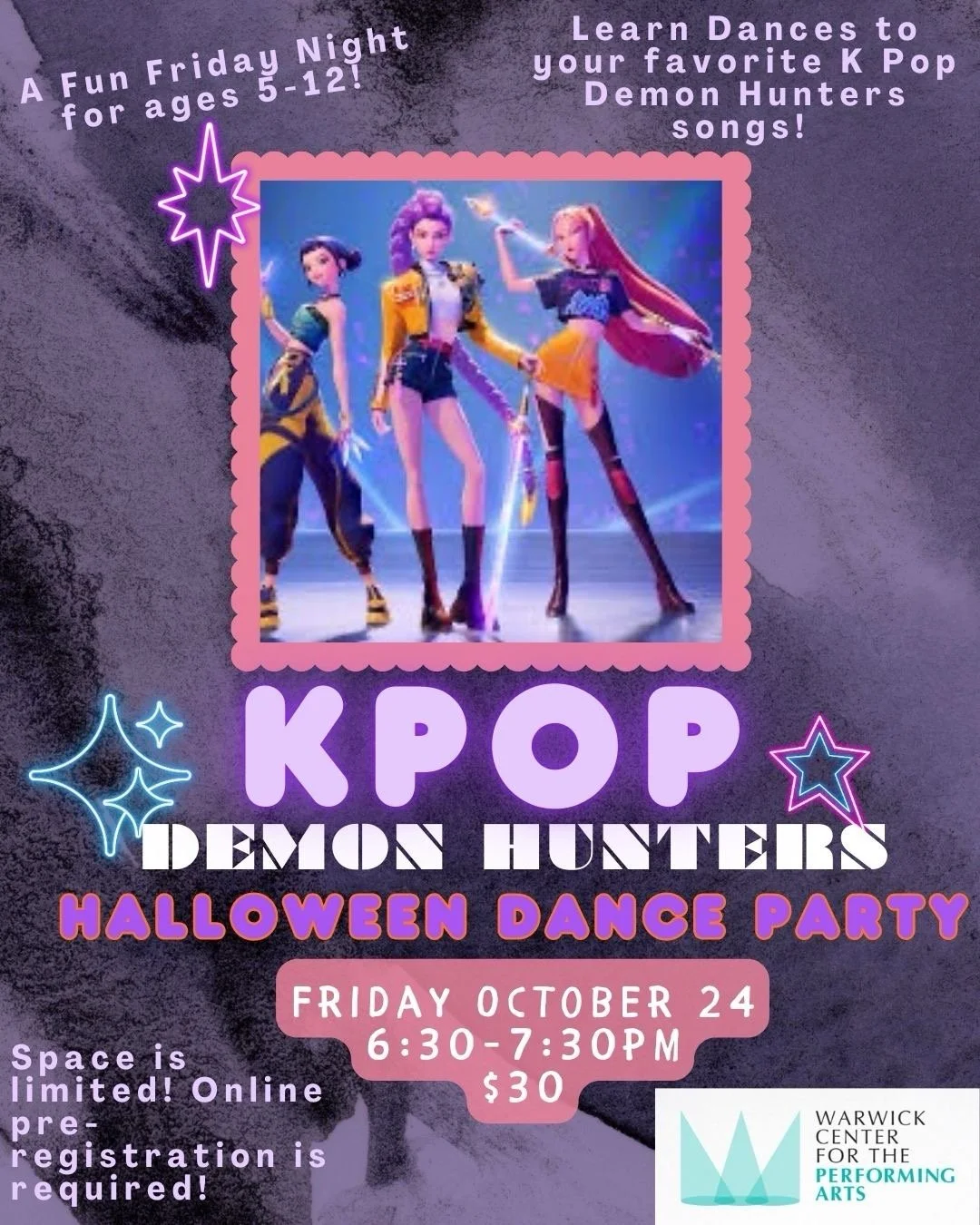 Join us for a K-Pop Demon Hunters Halloween bash! Learn the moves to hit songs from the show and dance the night away.