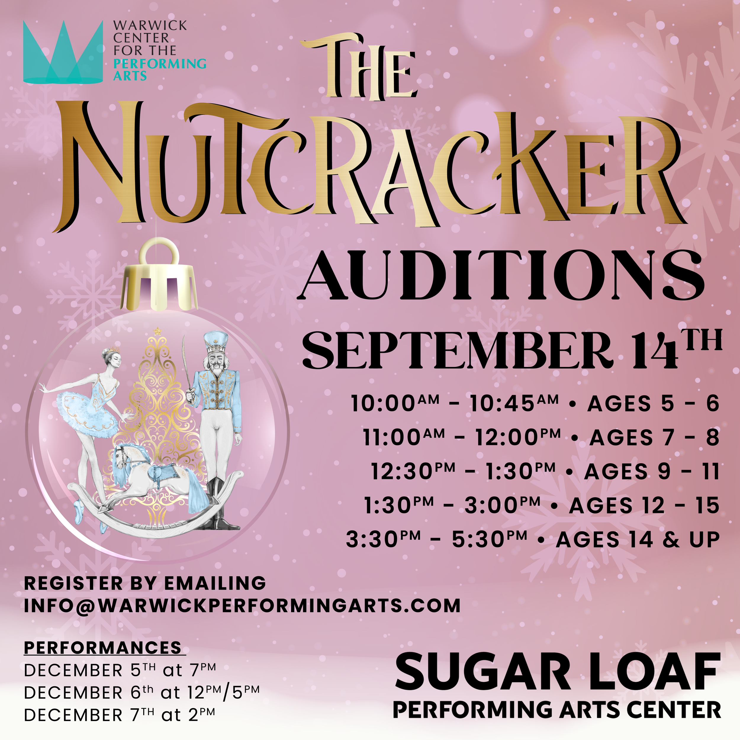 Warwick Performing Arts Center invites dancers ages 5–14 and up to audition for our holiday production of The Nutcracker. Performances will take place December 5 at 7PM, 6 at 12PM and 5PM, and 7 at 2PM. Details to follow.